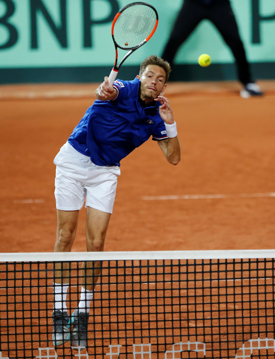 Tennis - Davis Cup - Semi-Final - France vs Serbia- Stade Pierre-Mauroy, Lille, France - September 16, 2017 France's Nicolas Mahut in action during his and Pierre-Hugues Herbert's doubles match against Serbia's Filip Krajinovic And Nenad Zimonjic REUTERS/Pascal Rossignol