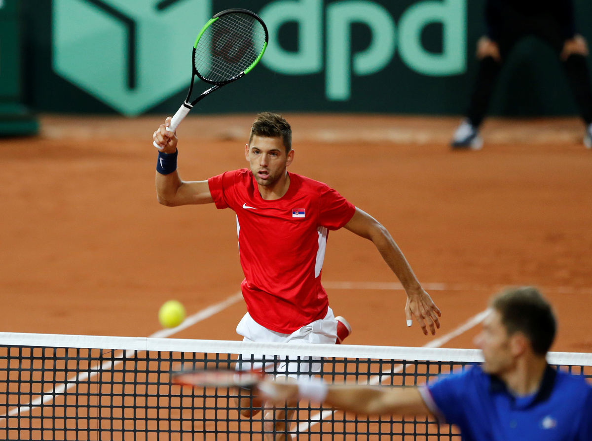 Tennis - Davis Cup - Semi-Final - France vs Serbia- Stade Pierre-Mauroy, Lille, France - September 16, 2017 Serbia's Filip Krajinovic in action during his and Nenad Zimonjic's doubles match against France's Pierre-Hugues Herbert and Nicolas Mahut REUTERS/Pascal Rossignol