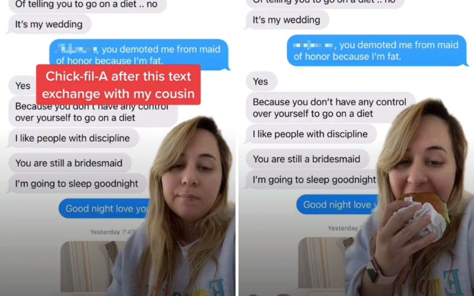 The bride then hit back with five messages, reading: “Yes. Because you don’t have any control over yourself to go on a diet. I like people with discipline. You are still a bridesmaid. I’m going to sleep, goodnight.”