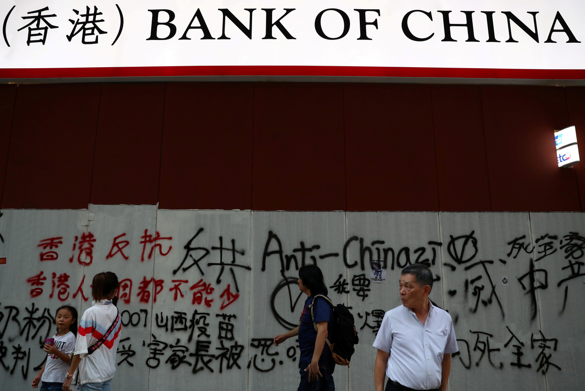 Activists have taken aim at some of China's largest banks during protests, smashing windows, spray-painting anti-China slogans on shuttered branches and trashing ATM machines.