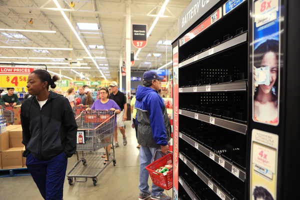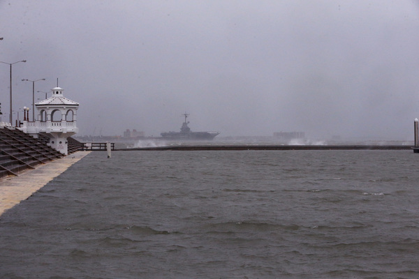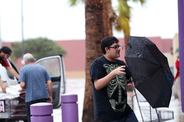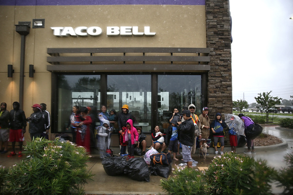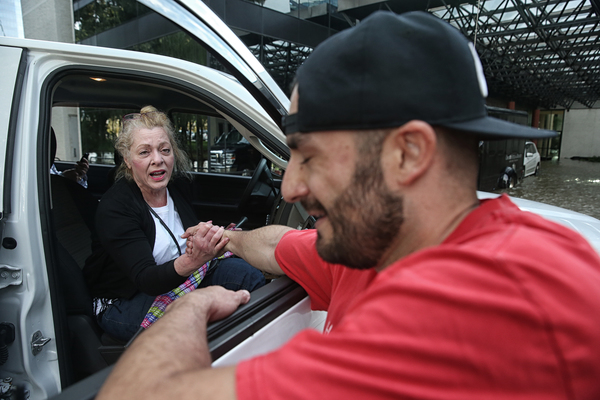 Houston highways remained mostly empty and blocked by police early Tuesday. A few cars and trucks navigated wet streets downtown, and some headed for the massive convention center. Thousands of people were sheltering inside there, many had arrived overnight, police said.