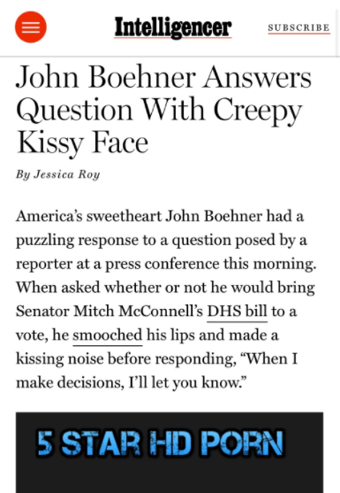 The images showed X-rated content popping up in articles, such as a New York agazine about John Boehner’s” creepy kissy face” and another Huffington Post story from 2017.