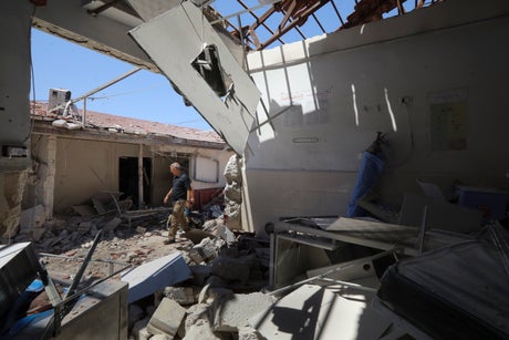Blood stained the floor of one debris-filled room, while a mangled wheelchair and a soiled stretcher were piled up in an operating theater.