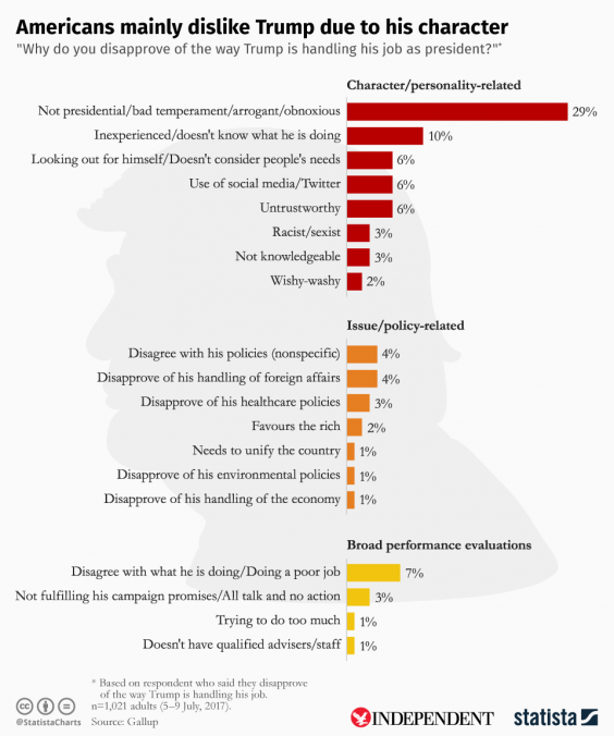 An equal amount of people found him "untrustworthy" and focused on his own administration's image rather than people's needs. Three per cent said his handling of healthcare is a reason for disapproval. The President has not done any public campaigning on the Republican replacement of Obamacare, which has received public backlash due to potentially rising premiums and cuts to programmes to help lower income, disabled, and older Americans.