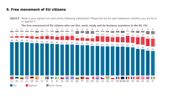 But the barometer of public opinion – commissioned by the EU Commission – appears to contradict the commonly held view that British people are not in favour of free movement.