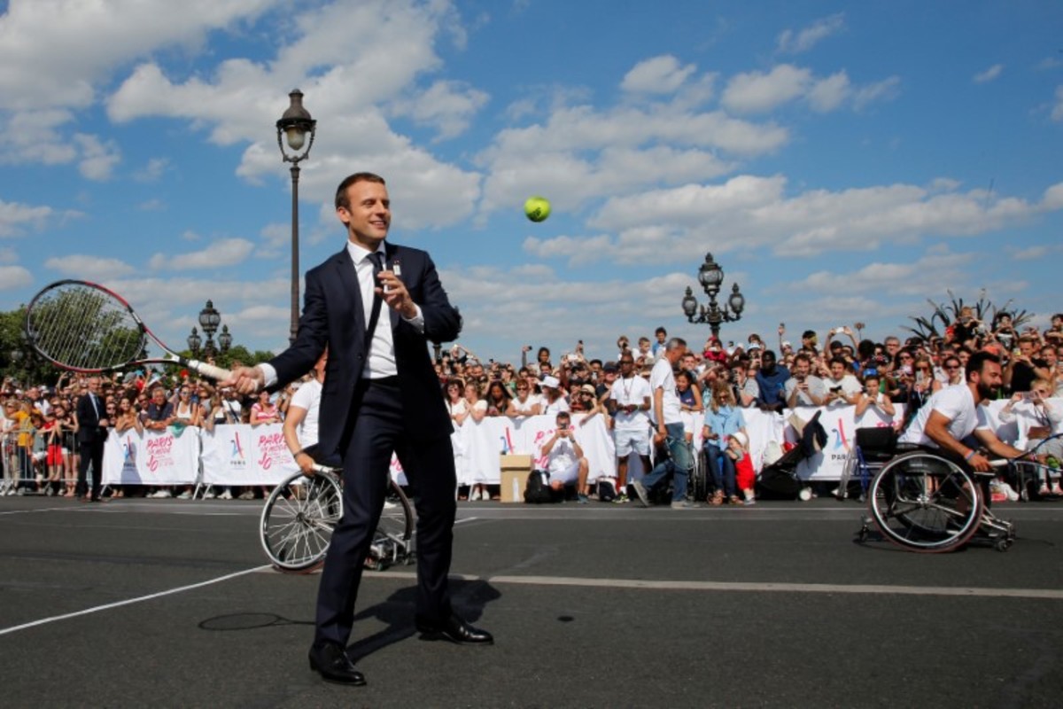 On Saturday, French President Emmanuel Macron, in a show of support for the Paris bid, visited an outdoor tennis court set up on the Alexandre III bridge across the Seine and hit a few balls with the players. He even briefly sat in a wheelchair to play wheelchair tennis.