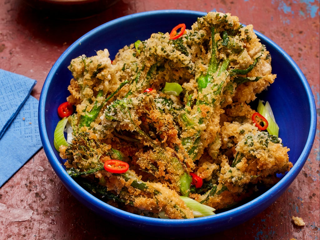4. When the oil is hot, working in batches, first toss the broccoli in the remaining cornflour, then coat in the batter and then toss in the breadcrumbs to lightly coat. Carefully place in the oil. Fry for one minute, turning if necessary, until the breadcrumbs are golden.