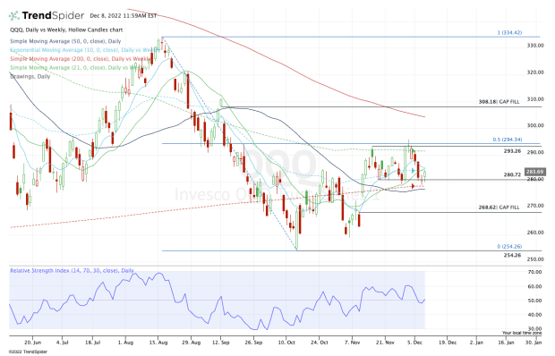 So it’s not surprising that the Invesco QQQ Trust Series (QQQ) is trapped between many key levels and does not have as bullish a chart as the others.