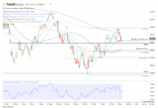 On the plus side, the SPY is holding the 10-week and 21-week moving averages, and is staying above last week’s low of $393.30.