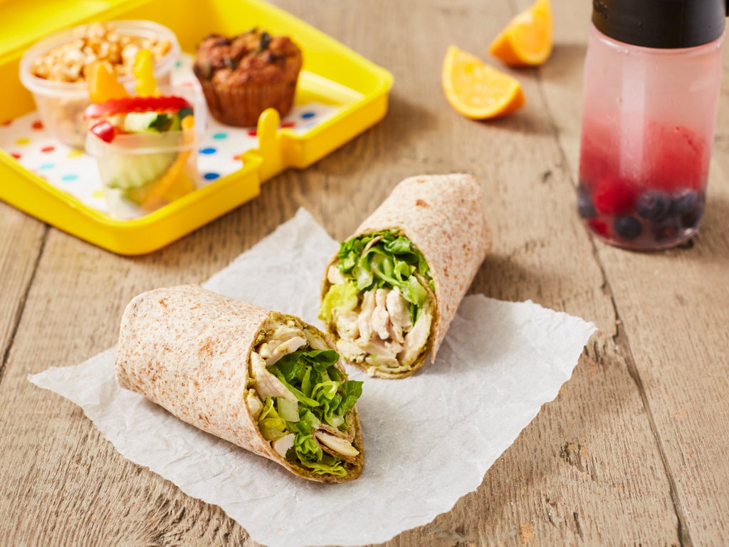 Spread the yoghurt or mayo over the wrap, then spoon the pesto down the middle using the back of the spoon. Pile the chicken on top, keeping it in a neat line, and top with lettuce, courgette, sliced tomatoes and grated carrot. Tuck in the sides then confidently roll the wrap over the filling until tightly wrapped up.