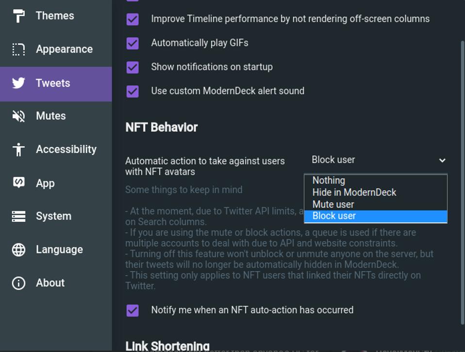 Lately there’s been an influx of NFT-centric accounts with unusual avatars. Have you seen them? They literally use non-fungible tokens as their Twitter profile photo. They seem to randomly follow me, likely because they want to spam me with NFT “opportunities” later. If you don’t want these coming anywhere near your timeline, ModernDeck has an extra special filter for you. Go into the “Tweets” tab, and auto-block them.