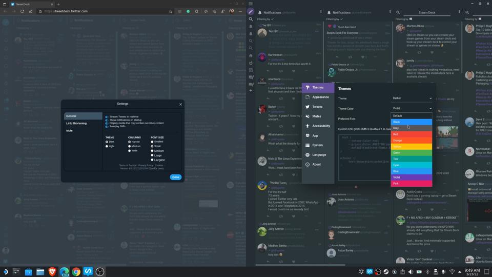 With TweetDeck, you're handed basic controls over content and appearance. But open up ModernDeck's settings panel and you can swap between 5 themes, a dozen accent colors and a handful of fonts. Beyond that, you can dial in the exact dimensions you want for column size, font size and profile photo size. If that's not enough, tailor it to your exact liking with custom CSS that can easily be reset to defaults if something goes wrong.
