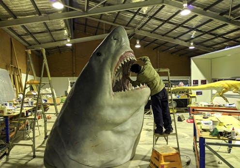 The Smithsonian’s megalodon model is a full-body reconstruction measuring 15 metres. The other, at the Museum Boola Bardip, is a beautifully crafted model of meg’s head. This was built under the direction of one of us (Mikael) and opened to the public in November.