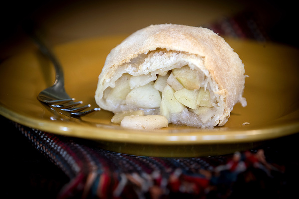 The knack is in working gently, but confidently, which may take a few tries. Because the dough is so thin, it will begin to grow brittle if the process takes too long. Once filled with apples and rolled, it must quickly be placed in the oven before the dough gets soggy.
