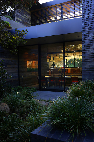 There is not a lot of color, but there is texture. Reclaimed wood fencing from Montana covers some walls while red cedar planks add a warm grain to the ceiling. An exposed stairway is framed by greenery and glass while low-maintenance green roofs filled with drought-tolerant plants add movement to the landscape.
