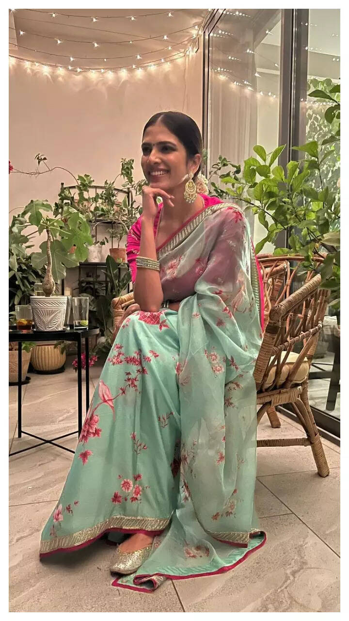 Malavika looks elegant in the floral-printed pastel saree.