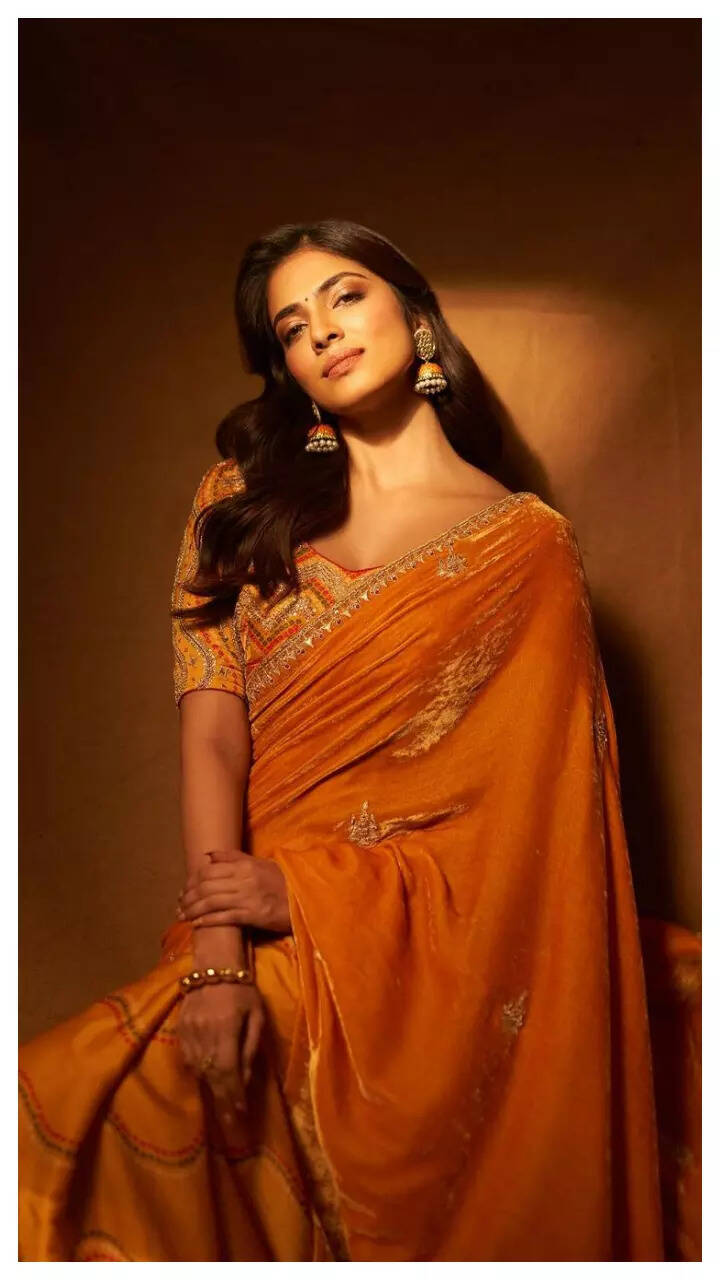 Malavika looks pretty in the mustard yellow saree.