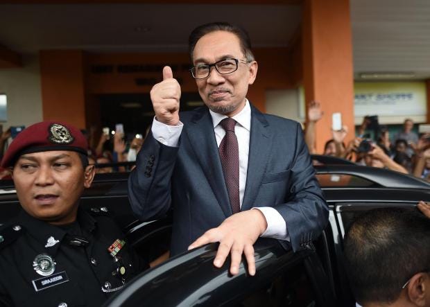 Mr Anwar, 70, waved to supporters and media as he left hospital on Wednesday, where he was recovering from a minor surgery. He had been serving his second stint in jail since 2015 on charges of sodomy, a conviction he says was politically motivated as he challenged the authority of now-ousted prime minister Najib Razak.