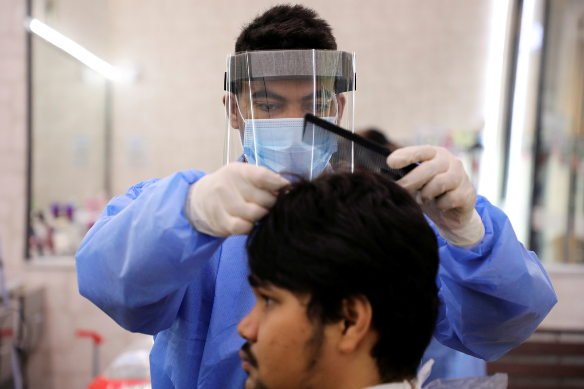 A barber wearing a protective suit cuts the hair of a customer at a barbershop after its reopening, amid the coronavirus disease (COVID-19) outbreak in Kuala Lumpur, Malaysia June 10, 2020. REUTERS/Lim Huey Teng