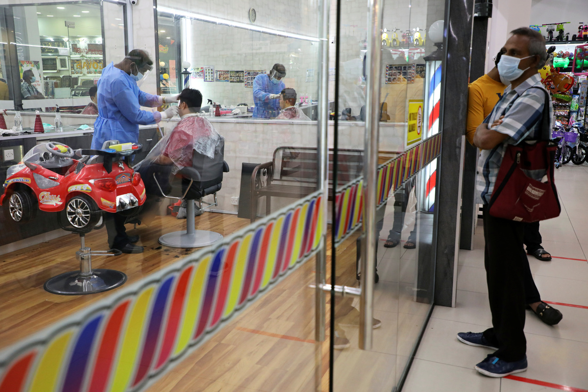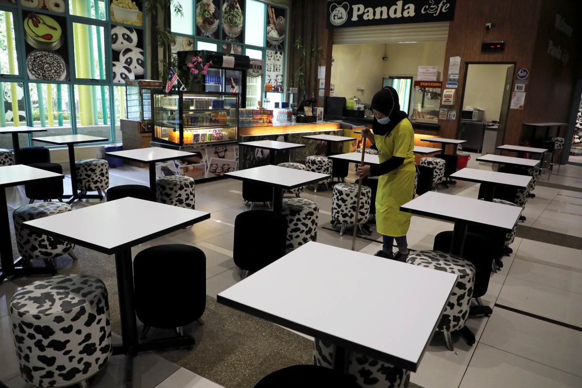 People wait in line outside a barbershop after its reopening, amid the coronavirus disease (COVID-19) outbreak in Kuala Lumpur, Malaysia June 10, 2020. REUTERS/Lim Huey TengA worker cleans a cafe at National Zoo, which re-opened after lockdown, amid the coronavirus disease (COVID-19) outbreak in Kuala Lumpur, Malaysia June 10, 2020. REUTERS/Lim Huey Teng