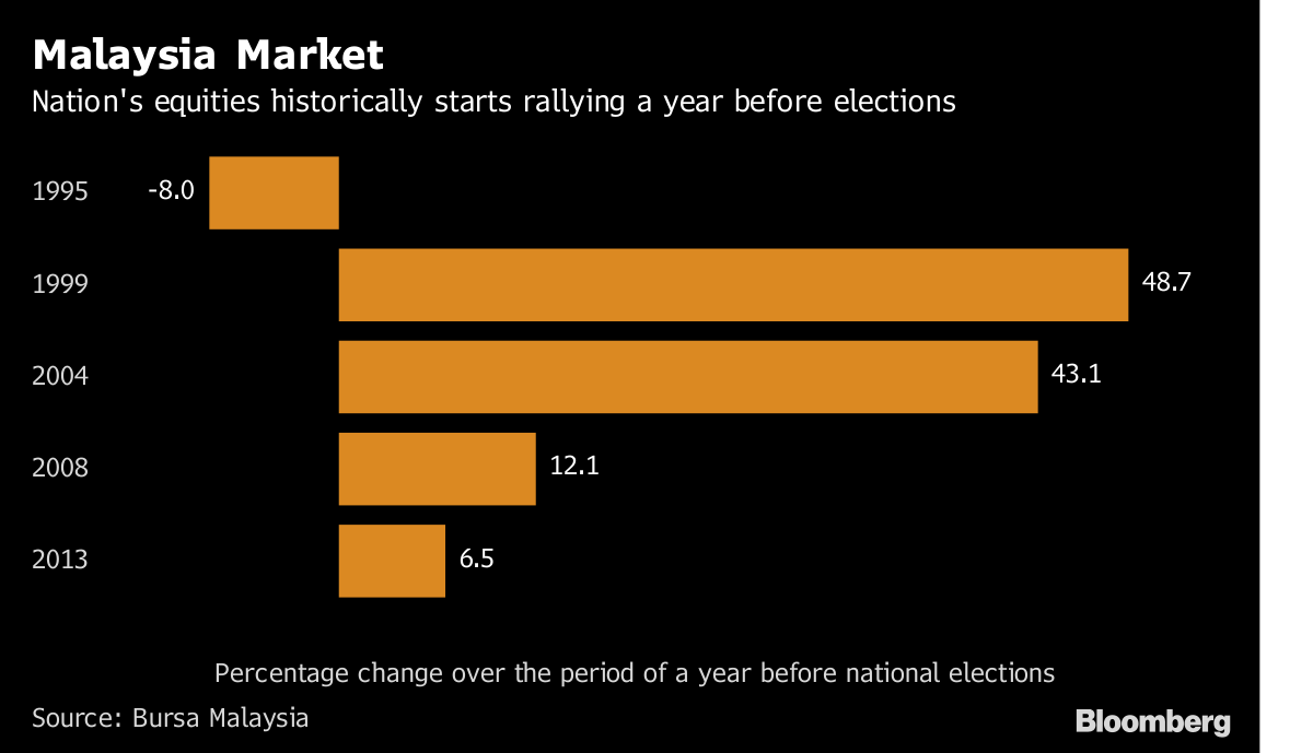 The move is similar to the past four rallies that started a year before Malaysia’s national elections as investors purchased shares of government-linked companies. Gains of as much as 49 percent were recorded over a 12-month timeframe before the nation held its 10th general election in November 1999, compared to a 6.5 percent rally in the most recent election held in 2013.