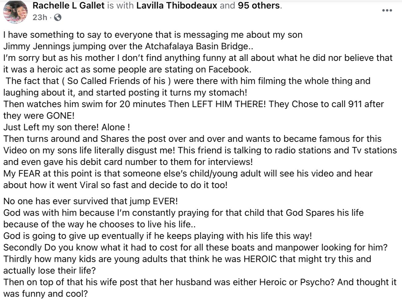 A Louisiana woman - who claims to be Jimmy’s mother - took to Facebook on Wednesday to address the incident: “I have something to say to everyone that is messaging me about my son Jimmy Jennings jumping over the Atchafalaya Basin Bridge”, she said - before elaborating in a lengthy statement.