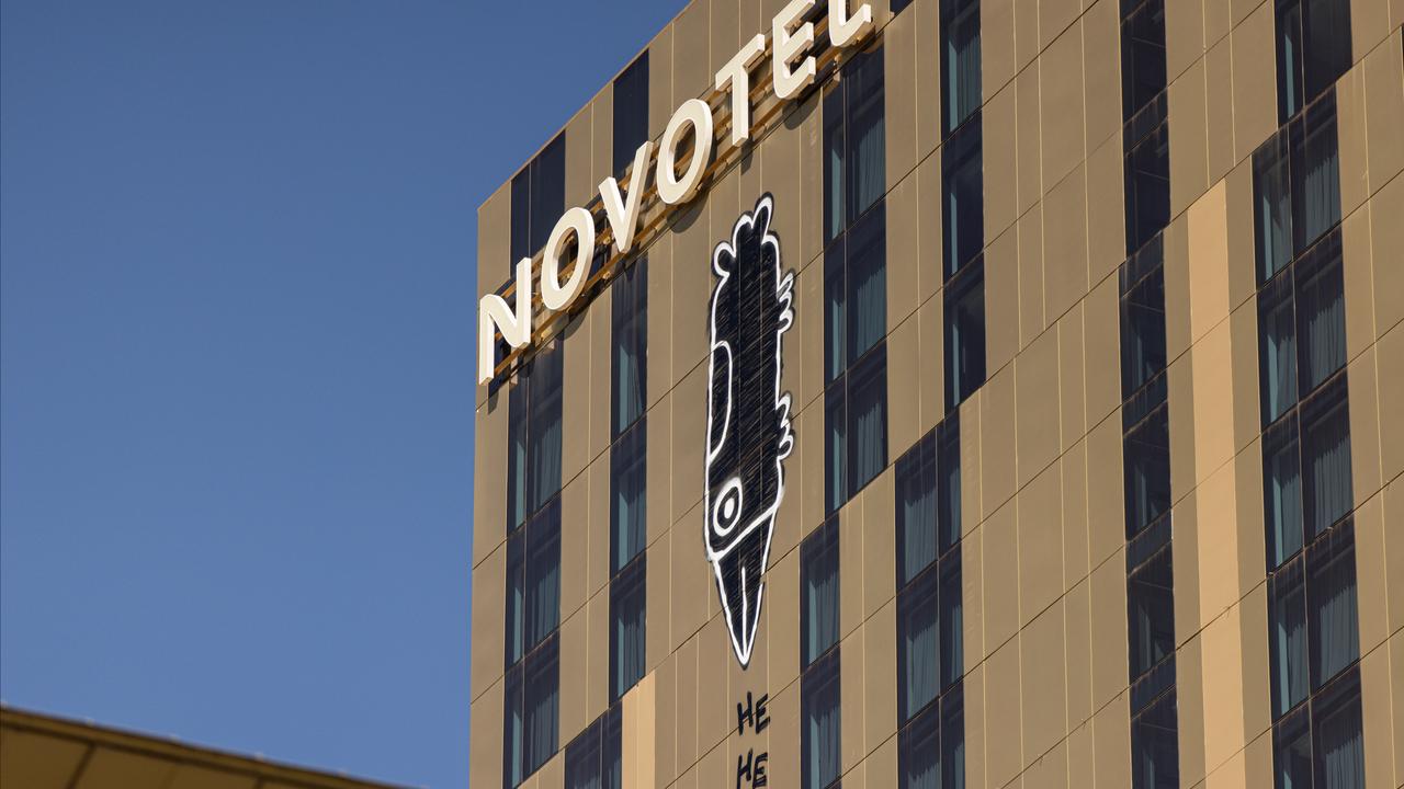 The golden Novotel Hotel on Collins Street is the latest site targeted, with the bird painted under its logo with the words "He He Meow" below it on January 20.