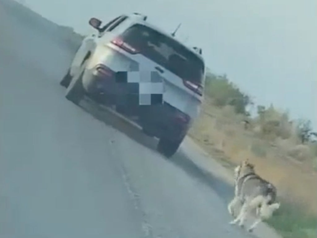 A younger man can be seen in the video unleashing the dog. The husky then lies down next to the car. The man reenters the car, which drives off, prompting the dog to chase after it. An older man can be seen in the video through the driver side mirror.
