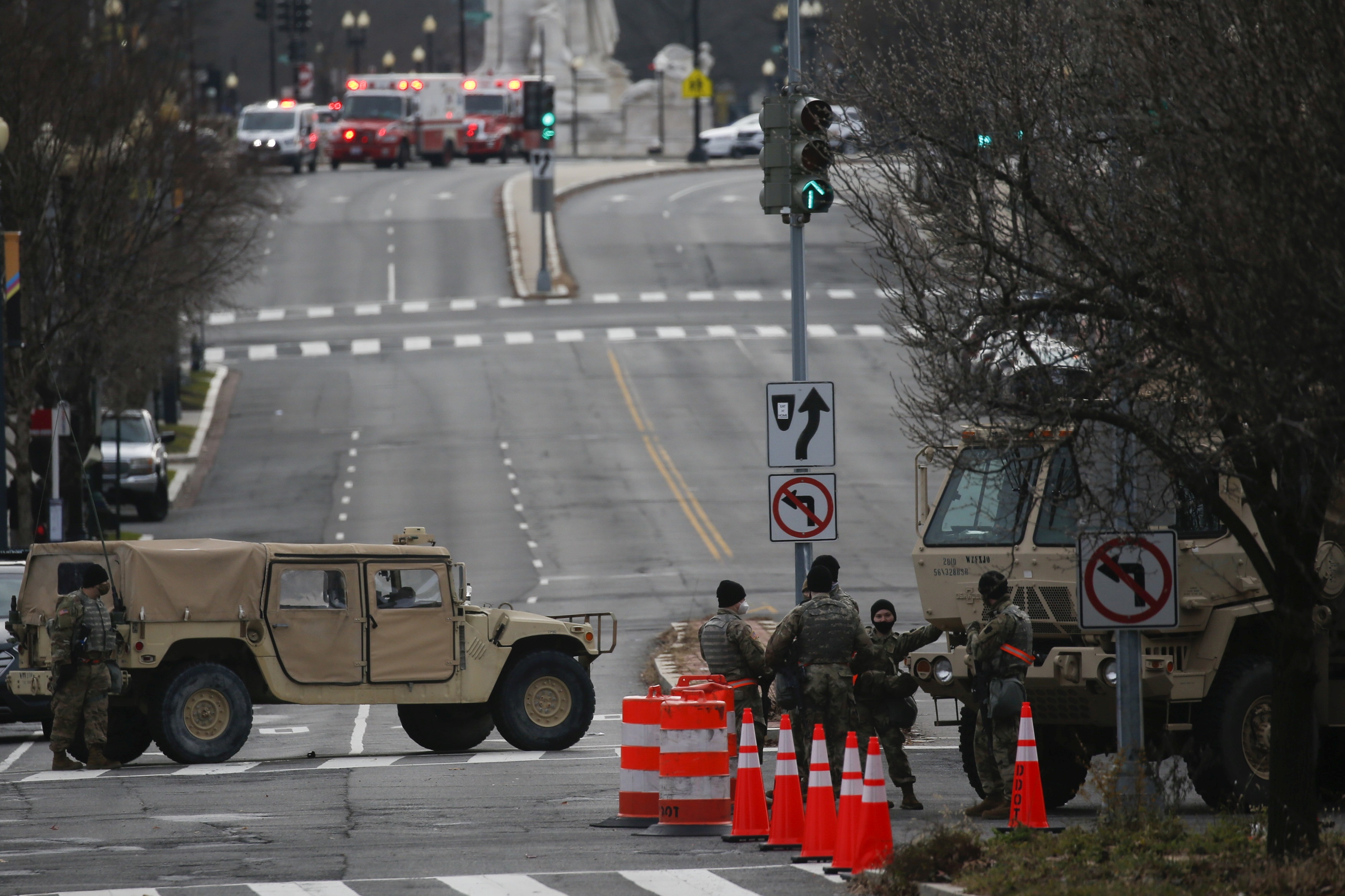 National Guard service members have joined increased law enforcement presence in the nation’s capital, with as many as 25,000 troops expected on the ground for the ceremony on 20 January, following a deadly insurrection at the US Capitol and threats of more far-right violence to follow.