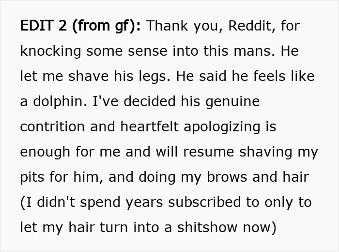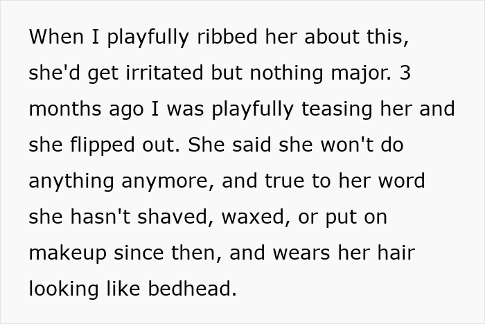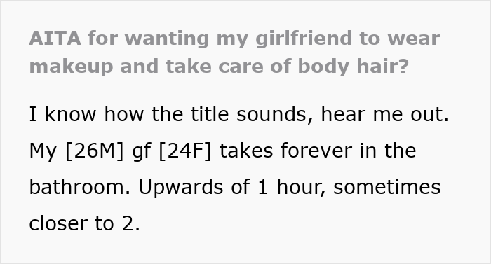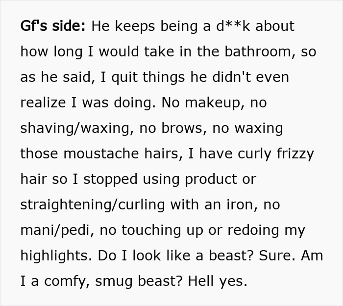This woman liked going the extra mile with her hygiene, which usually would take 1-2 hours. Her boyfriend liked teasing her about taking forever in the bathroom, but he soon came to regret it after she had had enough and stopped doing all of her beauty rituals.