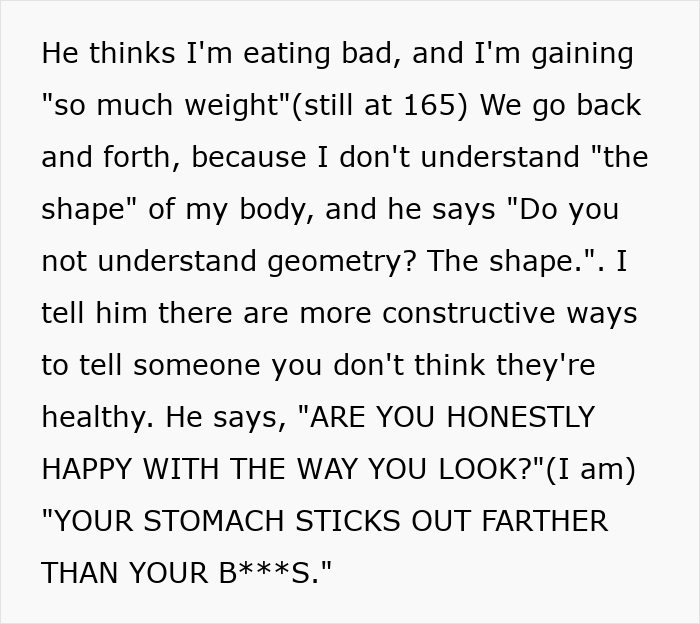 Not only is hearing negative comments about our bodies from significant others heartbreaking, but it is also considered a form of emotional abuse, experts say. One way that abusive partners gain power and control over their other half is by making them feel worse about themselves. They use body shaming to make their significant other feel more self-conscious, so they’re less likely to speak up and draw boundaries for themselves.