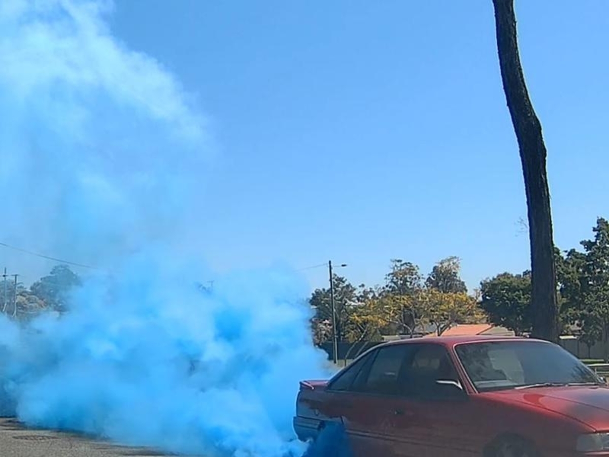 The woman filmed the man's red sedan fishtailing down the street while releasing a voluminous cloud of bright blue smoke at Logan, south of Brisbane.