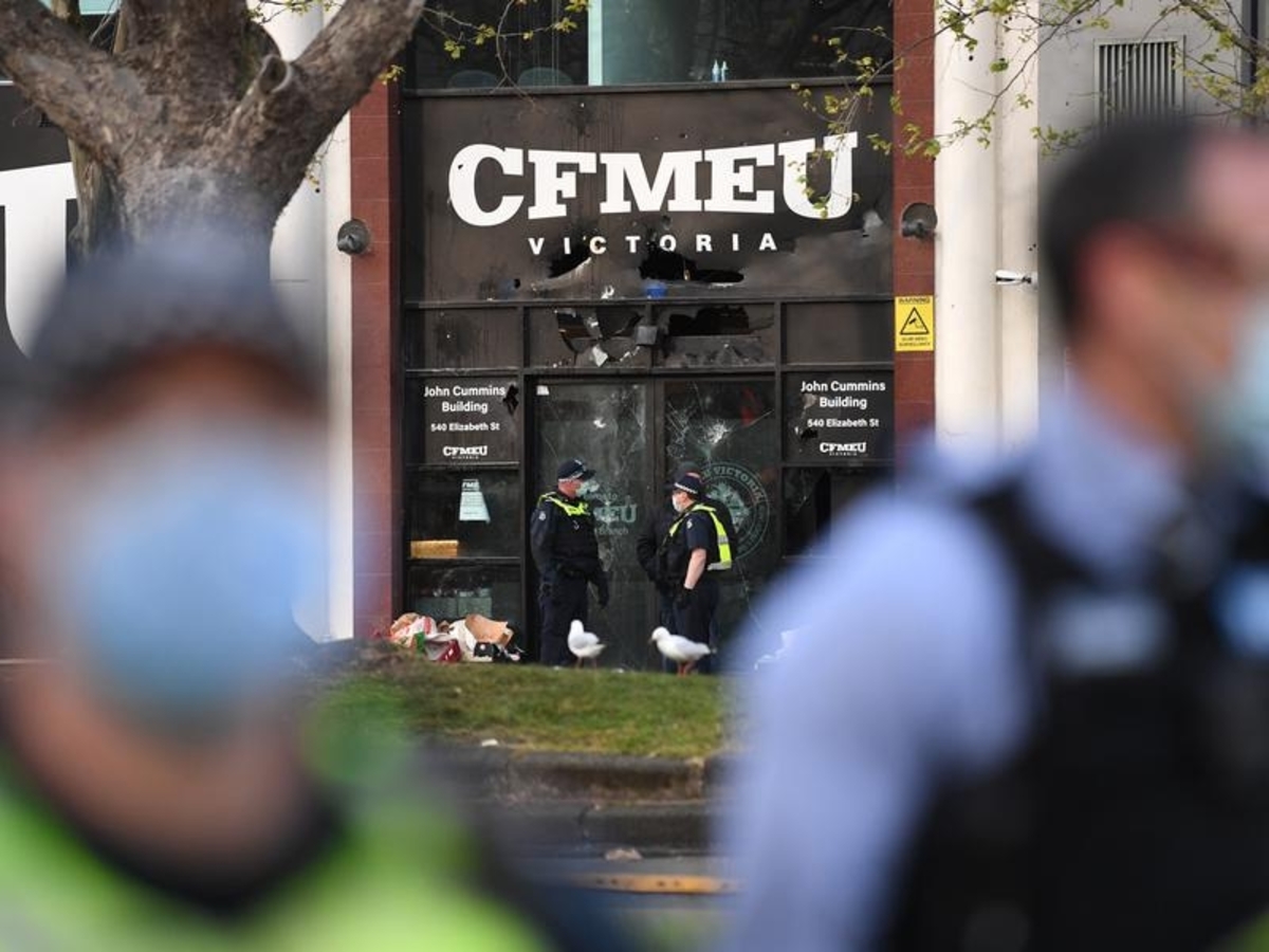A man was filmed kicking the dog during a brief fight on September 20 near the front of the CFMEU office on Elizabeth Street in Melbourne, where a crowd had gathered to protest the industry's COVID-19 vaccine mandate and other restrictions.