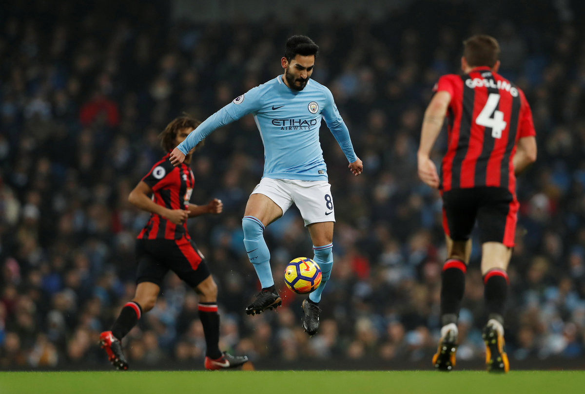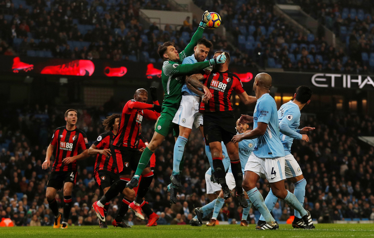 LONDON (Reuters) - Manchester City extended their winning sequence to 17 and their lead at the top of the Premier League to 13 points with a 4-0 thrashing of Bournemouth on Saturday as Manchester United were held 2-2 at Leicester City and champions Chelsea suffered a goalless stalemate at Everton.