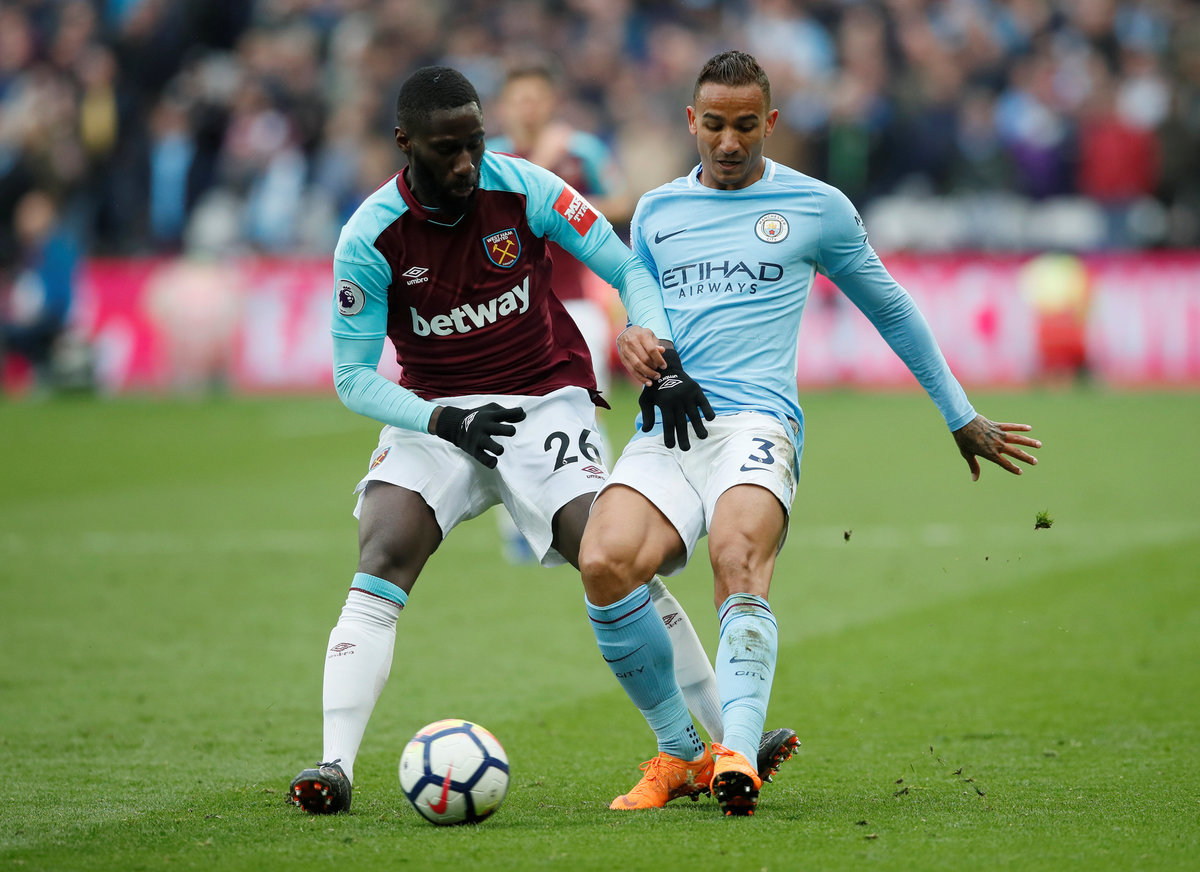 Soccer Football - Premier League - West Ham United v Manchester City - London Stadium, London, Britain - April 29, 2018 West Ham United's Arthur Masuaku in action with Manchester City's Danilo REUTERS/David Klein