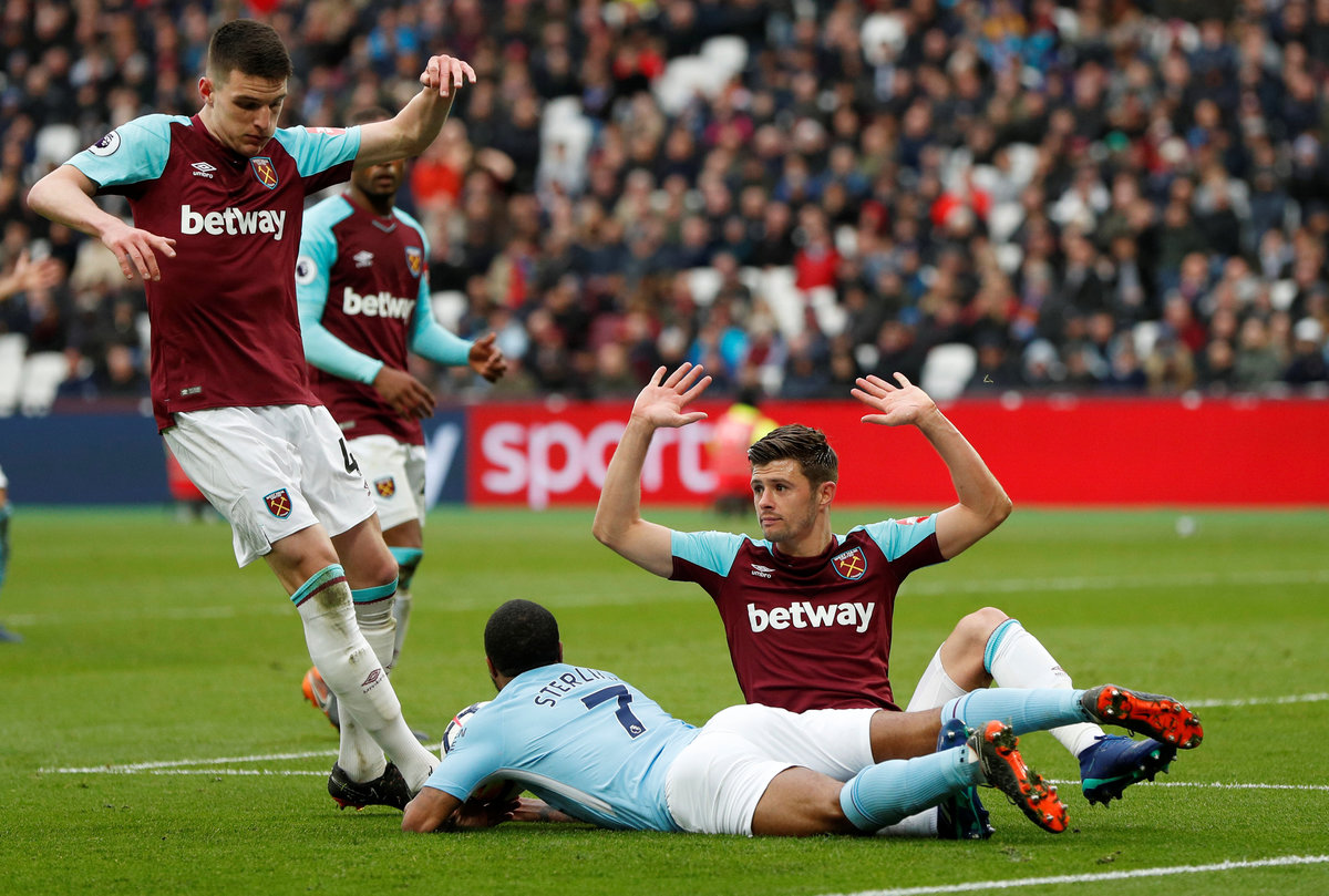 Soccer Football - Premier League - West Ham United v Manchester City - London Stadium, London, Britain - April 29, 2018 Manchester City's Raheem Sterling is challenged in the area by West Ham United's Aaron Cresswell however a penalty is not awarded Action Images via Reuters/John Sibley