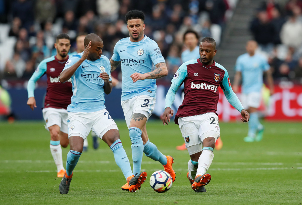 Soccer Football - Premier League - West Ham United v Manchester City - London Stadium, London, Britain - April 29, 2018 West Ham United's Patrice Evra in action with Manchester City's Kyle Walker and Fernandinho REUTERS/David Klein