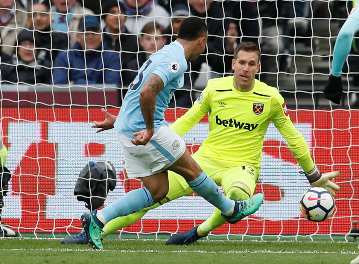 Soccer Football - Premier League - West Ham United v Manchester City - London Stadium, London, Britain - April 29, 2018 Manchester City's Gabriel Jesus scores their third goal Action Images via Reuters/John Sibley