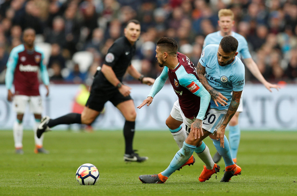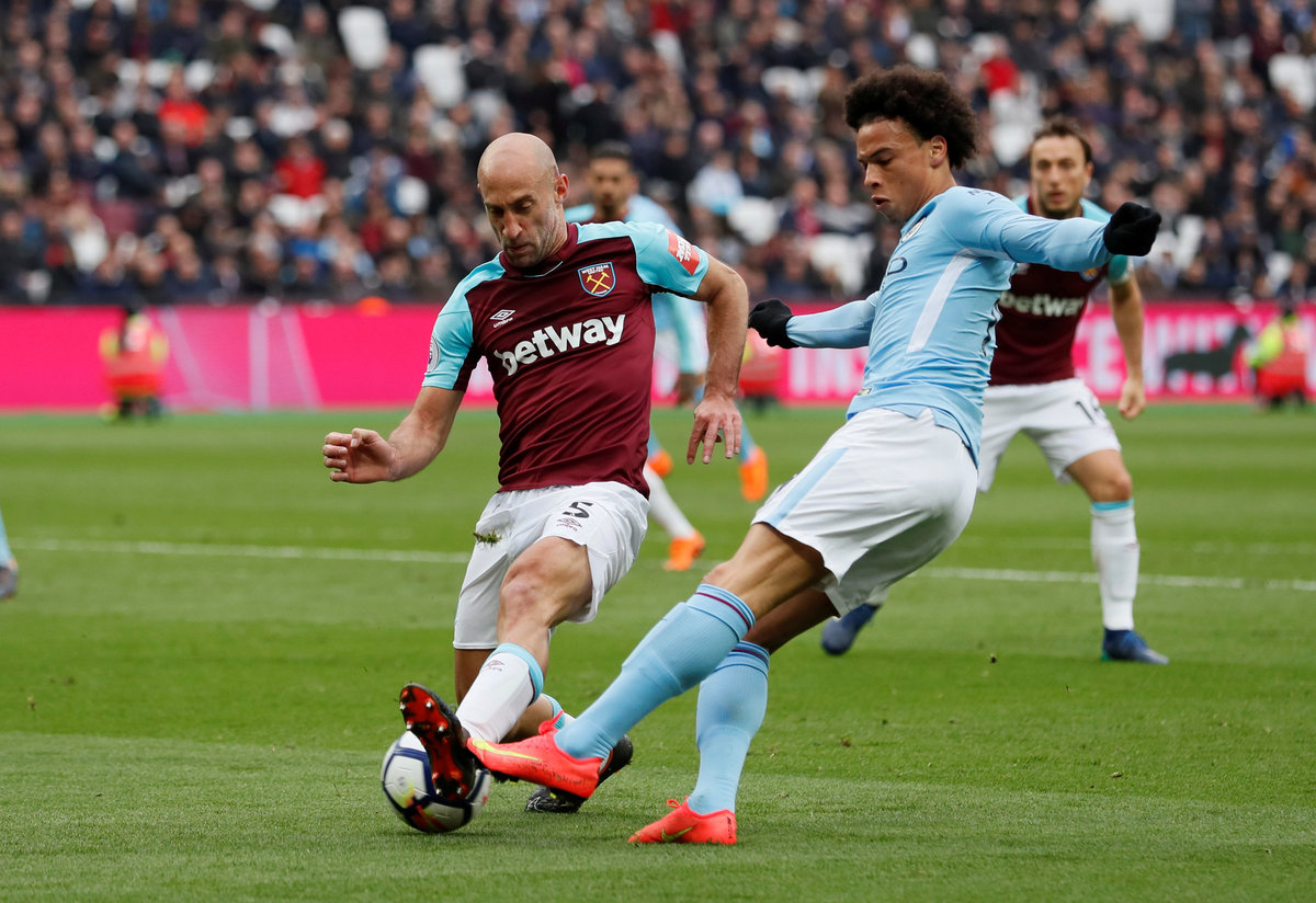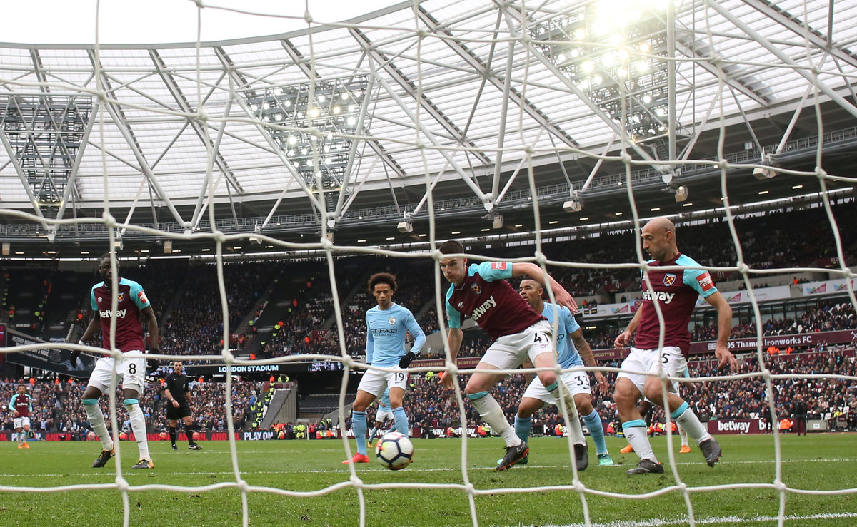 Former City defender Pablo Zabaleta put through his own net 14 minutes later to score City's 100th Premier League goal of the season before Aaron Cresswell curled home a 42nd-minute free kick to get West Ham back in it.