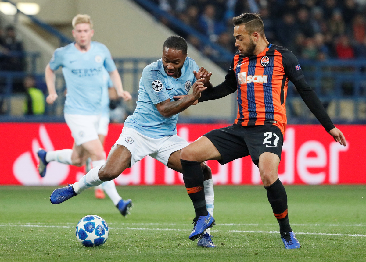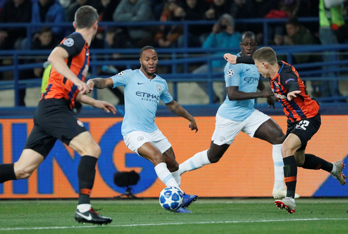 Soccer Football - Champions League - Group Stage - Group F - Shakhtar Donetsk v Manchester City - Metalist Stadium, Kharkiv, Ukraine - October 23, 2018 Manchester City's Raheem Sterling in action with Shakhtar Donetsk's Maycon REUTERS/Gleb Garanich
