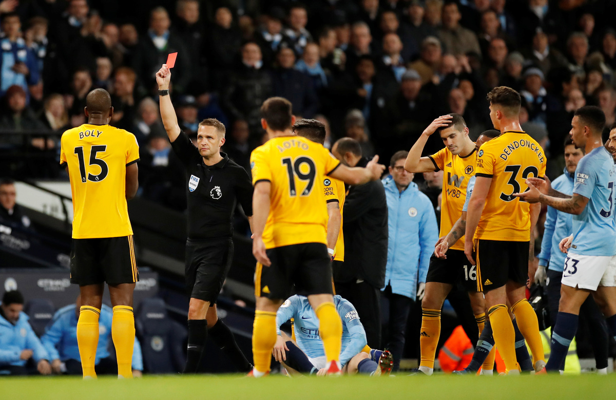 What was already a tough assignment for Wolves became a seemingly impossible one nine minutes later when Boly launched into a tackle on Bernardo Silva and won the ball but also left the City midfielder rolling around with his follow through.