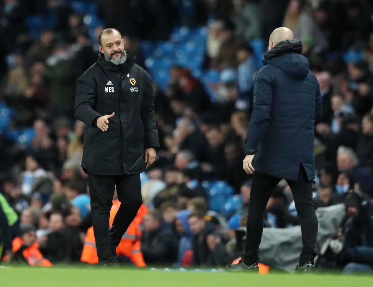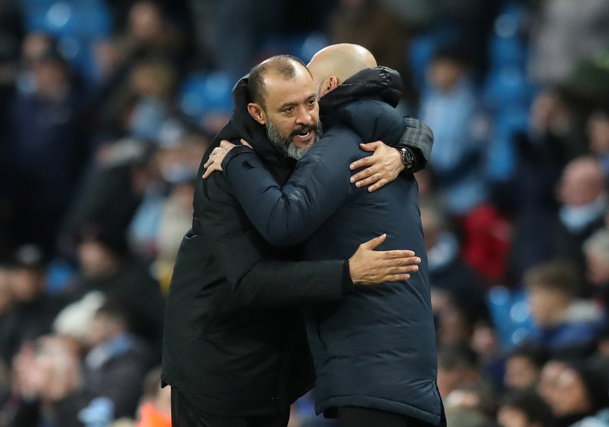 Soccer Football - Premier League - Manchester City v Wolverhampton Wanderers - Etihad Stadium, Manchester, Britain - January 14, 2019 Wolverhampton Wanderers manager Nuno Espirito Santo and Manchester City manager Pep Guardiola after the match REUTERS/Jon Super