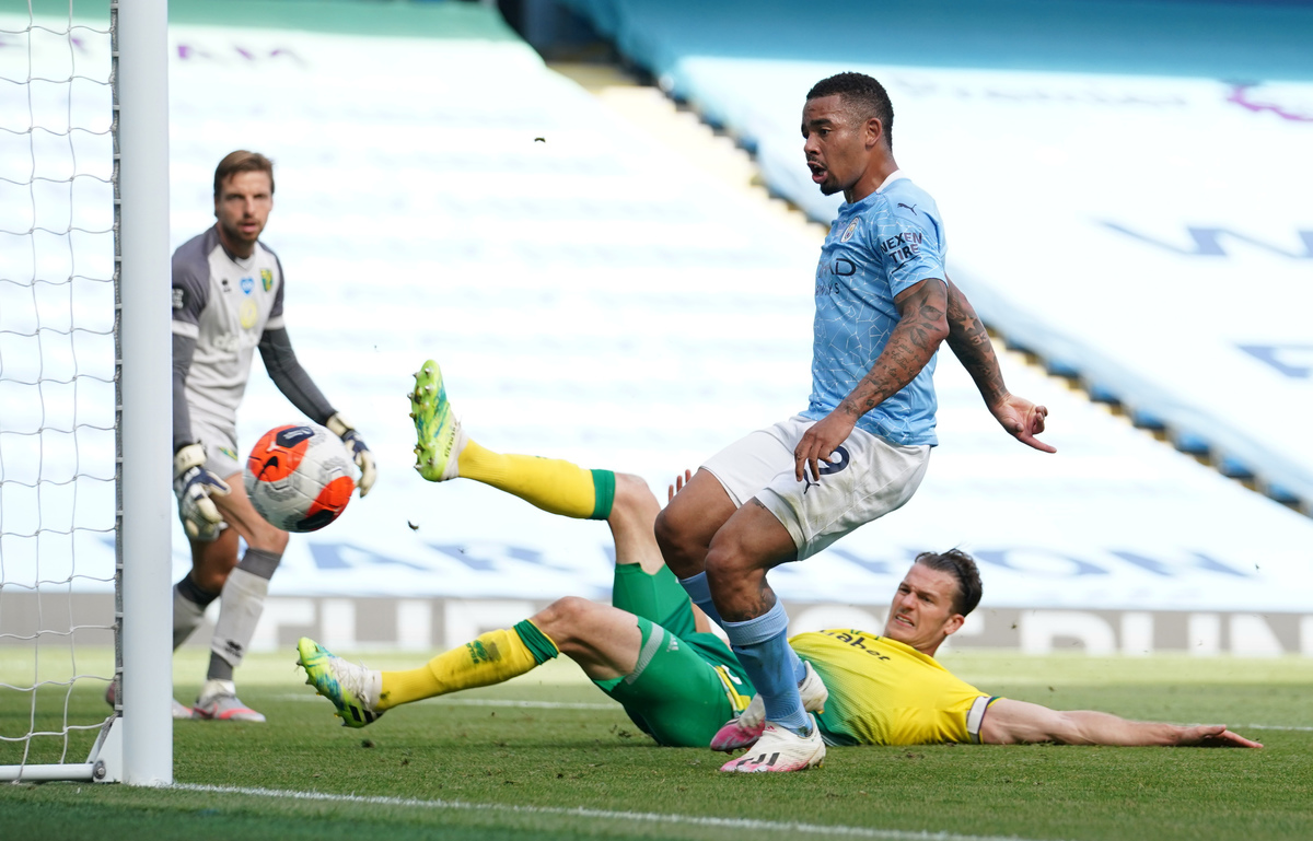 Brazil striker Jesus stabbed home City's opener from close range in the 11th minute from Sterling's low cross after the England winger sparked panic on Norwich's right with a quick exchange of passes with De Bruyne.