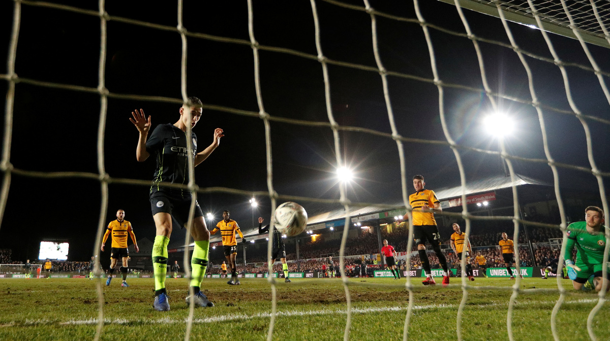 (Reuters) - Manchester City endured some anxious moments but escaped from fourth-tier Newport County with their FA Cup hopes intact as Phil Foden scored twice in an ultimately comfortable 4-1 fifth-round victory on Saturday.