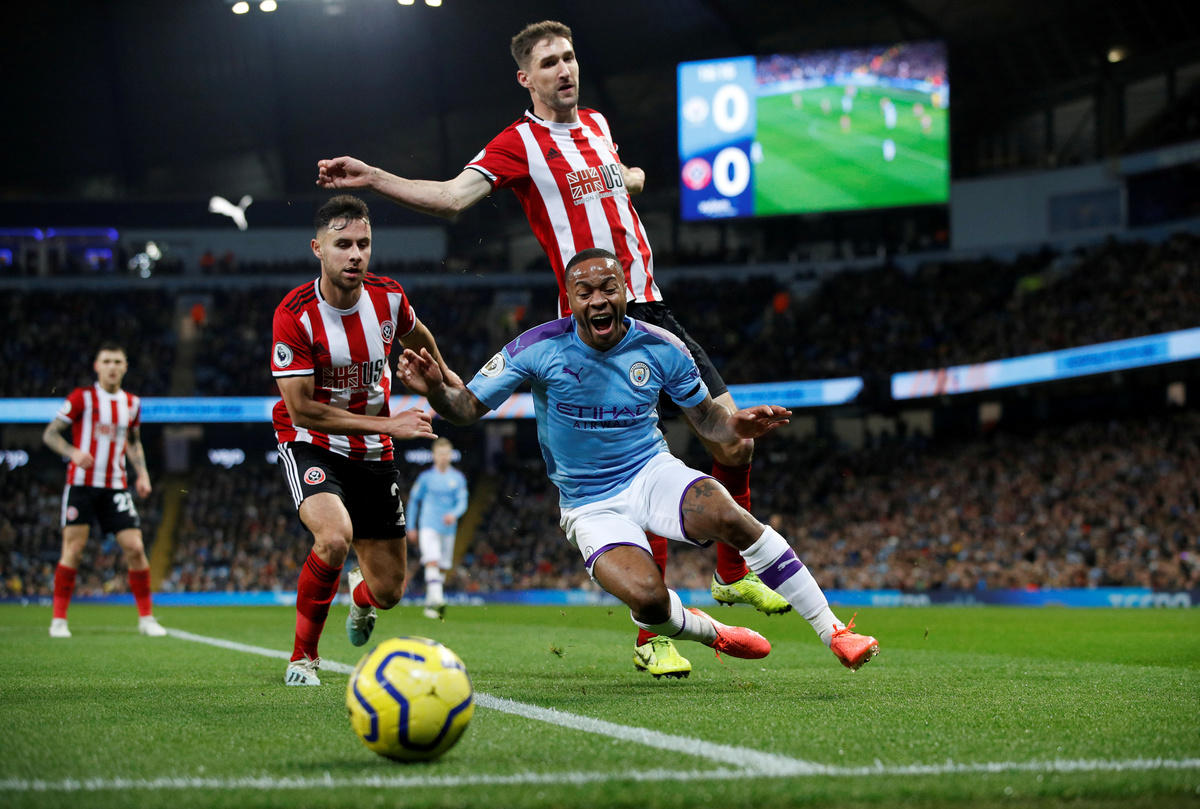 Soccer Football - Premier League - Manchester City v Sheffield United - Etihad Stadium, Manchester, Britain - December 29, 2019 Manchester City's Raheem Sterling in action with Sheffield United's Chris Basham REUTERS/Phil Noble