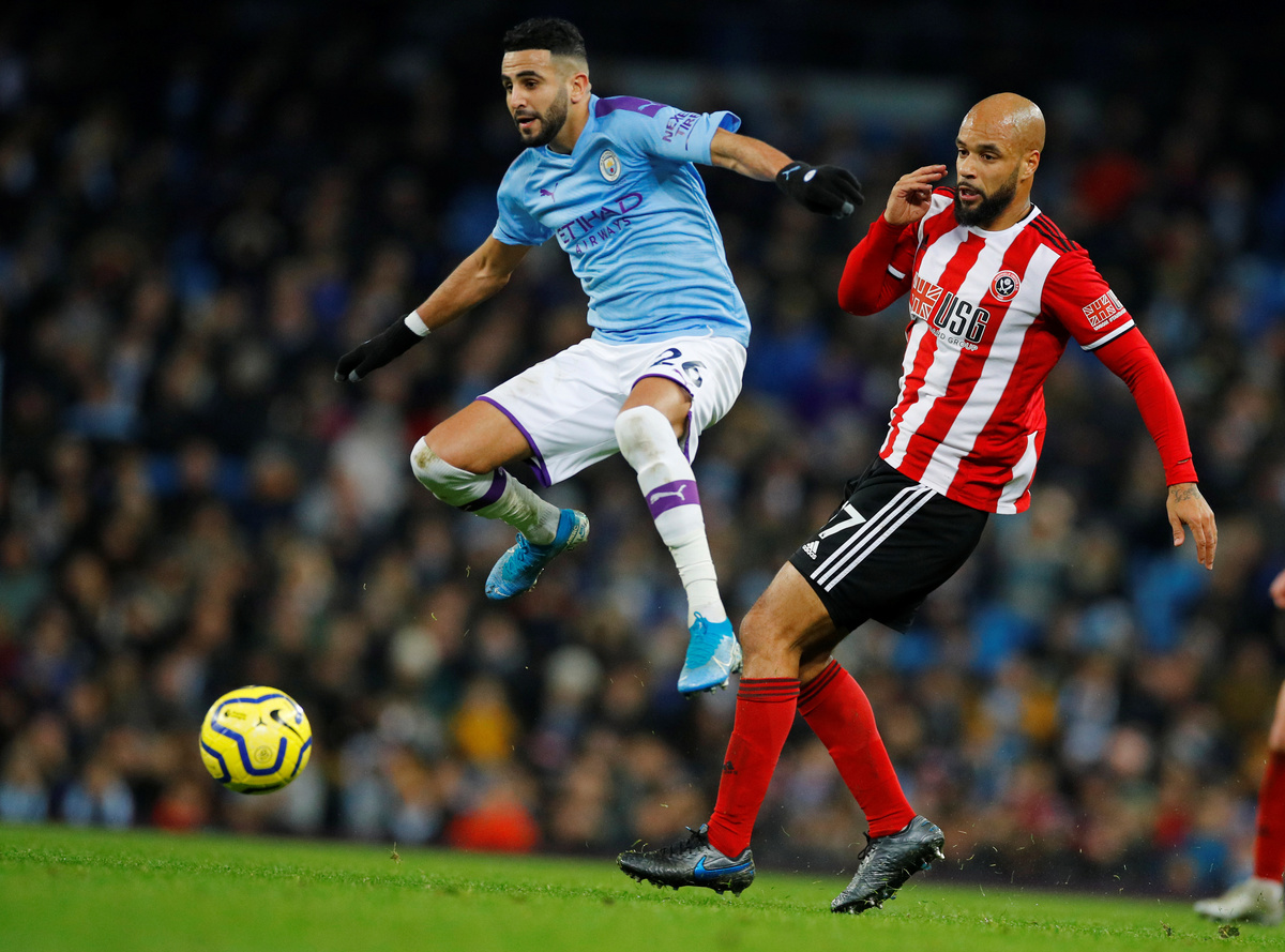 Soccer Football - Premier League - Manchester City v Sheffield United - Etihad Stadium, Manchester, Britain - December 29, 2019 Manchester City's Riyad Mahrez in action with Sheffield United's David McGoldrick REUTERS/Phil Noble