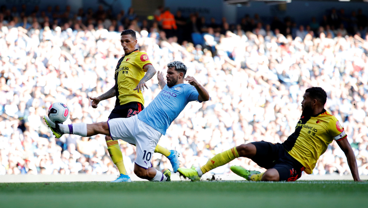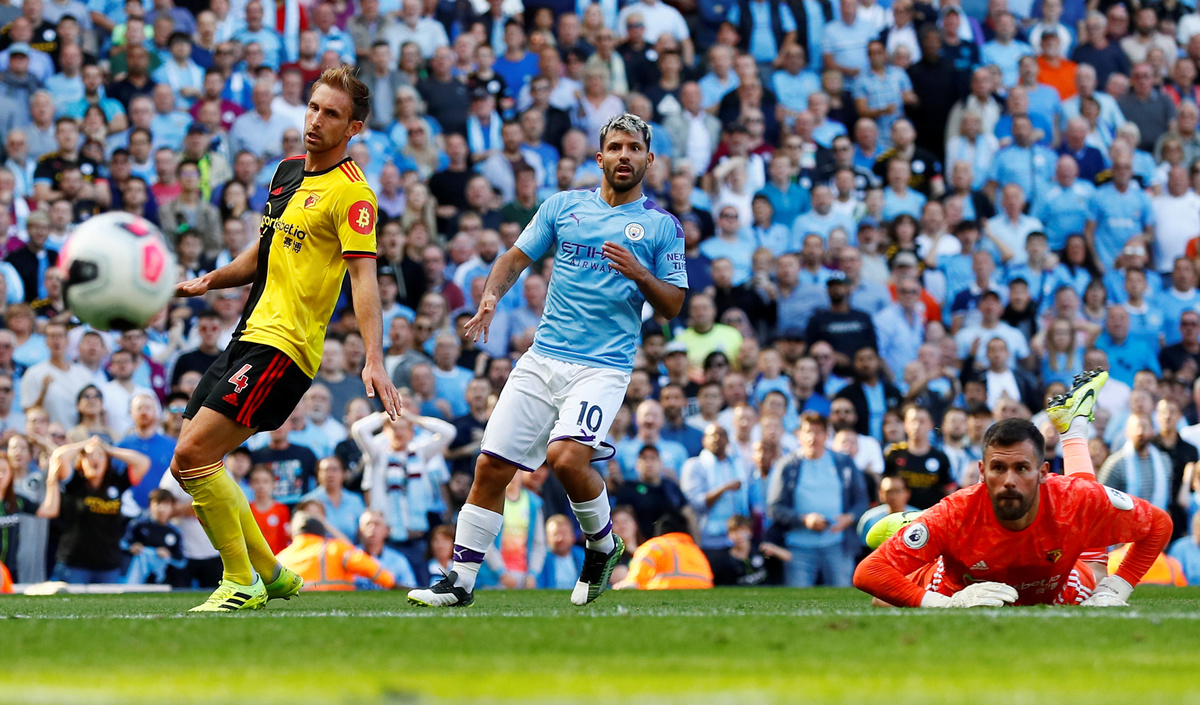 Soccer Football - Premier League - Manchester City v Watford - Etihad Stadium, Manchester, Britain - September 21, 2019 Manchester City's Sergio Aguero scores their second goal from the penalty spot Action Images via Reuters/Jason Cairnduff