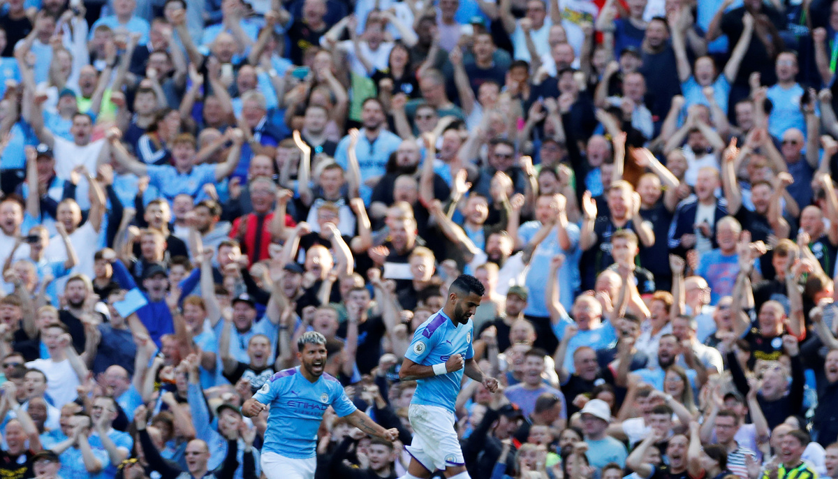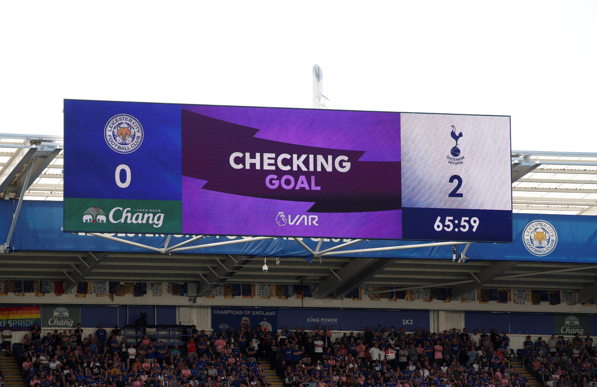 Soccer Football - Premier League - Leicester City v Tottenham Hotspur - King Power Stadium, Leicester, Britain - September 21, 2019 The big screen displays a VAR review message before a goal scored by Tottenham Hotspur's Serge Aurier is disallowed REUTERS/David Klein Soccer Football - Premier League - Manchester City v Watford - Etihad Stadium, Manchester, Britain - September 21, 2019 Manchester City's Riyad Mahrez celebrates scoring their third goal REUTERS/Phil Noble Soccer Football - Premier League - Manchester City v Watford - Etihad Stadium, Manchester, Britain - September 21, 2019 Manchester City's Sergio Aguero in action REUTERS/Phil Noble Soccer Football - Premier League - Leicester City v Tottenham Hotspur - King Power Stadium, Leicester, Britain - September 21, 2019 Leicester City's Wilfred Ndidi scores a goal before it is disallowed REUTERS/David Klein Soccer Football - Premier League - Manchester City v Watford - Etihad Stadium, Manchester, Britain - September 21, 2019 Manchester City's Bernardo Silva holds the matchball as he celebrates scoring a hat-trick after the match REUTERS/Phil Noble Soccer Football - Premier League - Manchester City v Watford - Etihad Stadium, Manchester, Britain - September 21, 2019 Watford's Ben Foster and Craig Dawson look on as Manchester City's Sergio Aguero shoots wide Action Images via Reuters/Jason Cairnduff Soccer Football - Premier League - Manchester City v Watford - Etihad Stadium, Manchester, Britain - September 21, 2019 Manchester City's Nicolas Otamendi celebrates scoring their fifth goal with teammate Sergio Aguero Action Images via Reuters/Jason Cairnduff