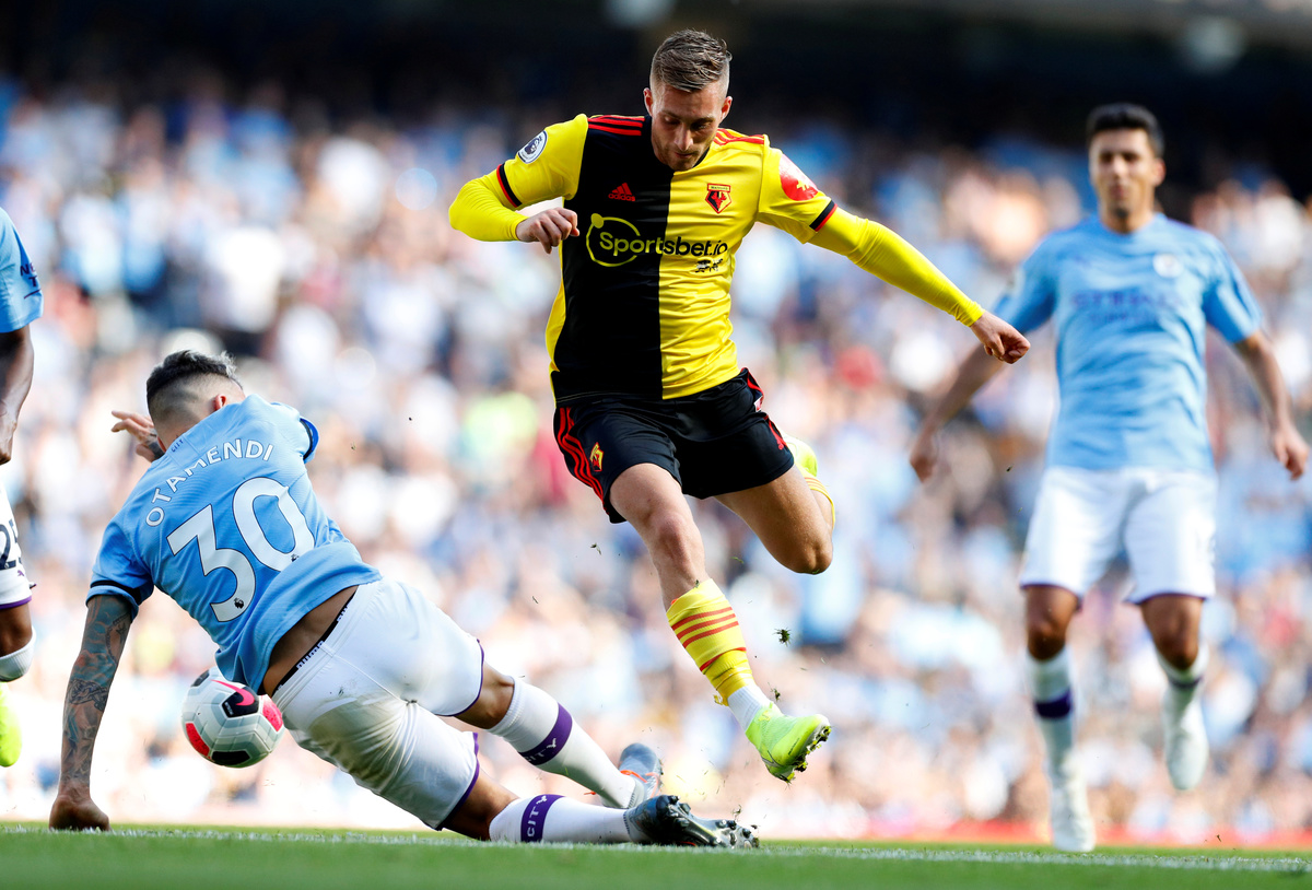 Soccer Football - Premier League - Manchester City v Watford - Etihad Stadium, Manchester, Britain - September 21, 2019 Watford's Gerard Deulofeu in action with Manchester City's Nicolas Otamendi REUTERS/Phil Noble
