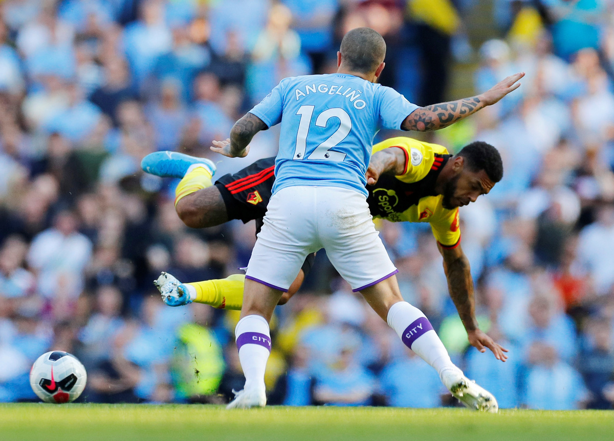 Soccer Football - Premier League - Manchester City v Watford - Etihad Stadium, Manchester, Britain - September 21, 2019 Manchester City's Angelino in action with Watford's Andre Gray REUTERS/Phil Noble
